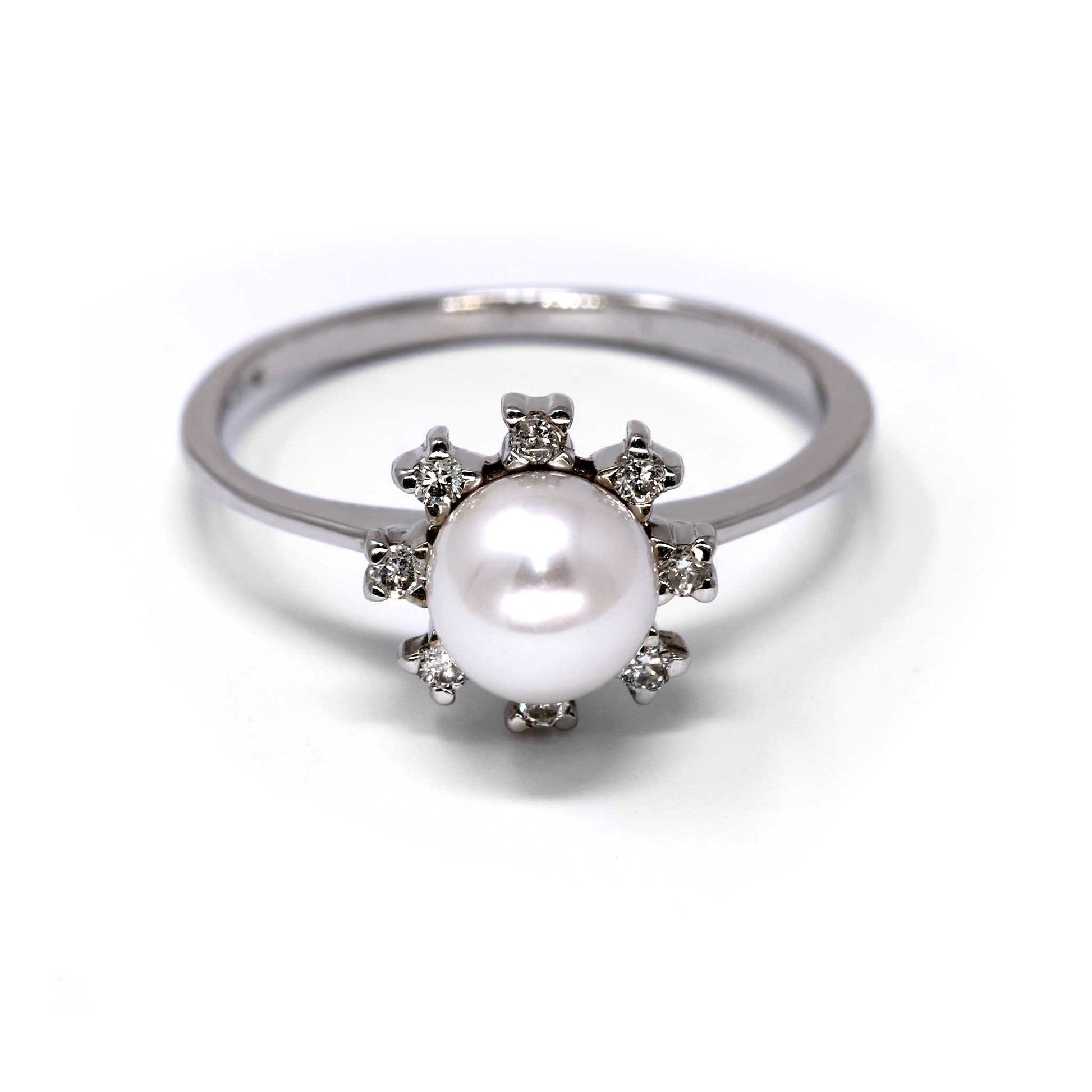 Anello con 1 perla Akoya 6/6,5 mm centrale e 8 diamanti bianchi a girare intorno alla perla.