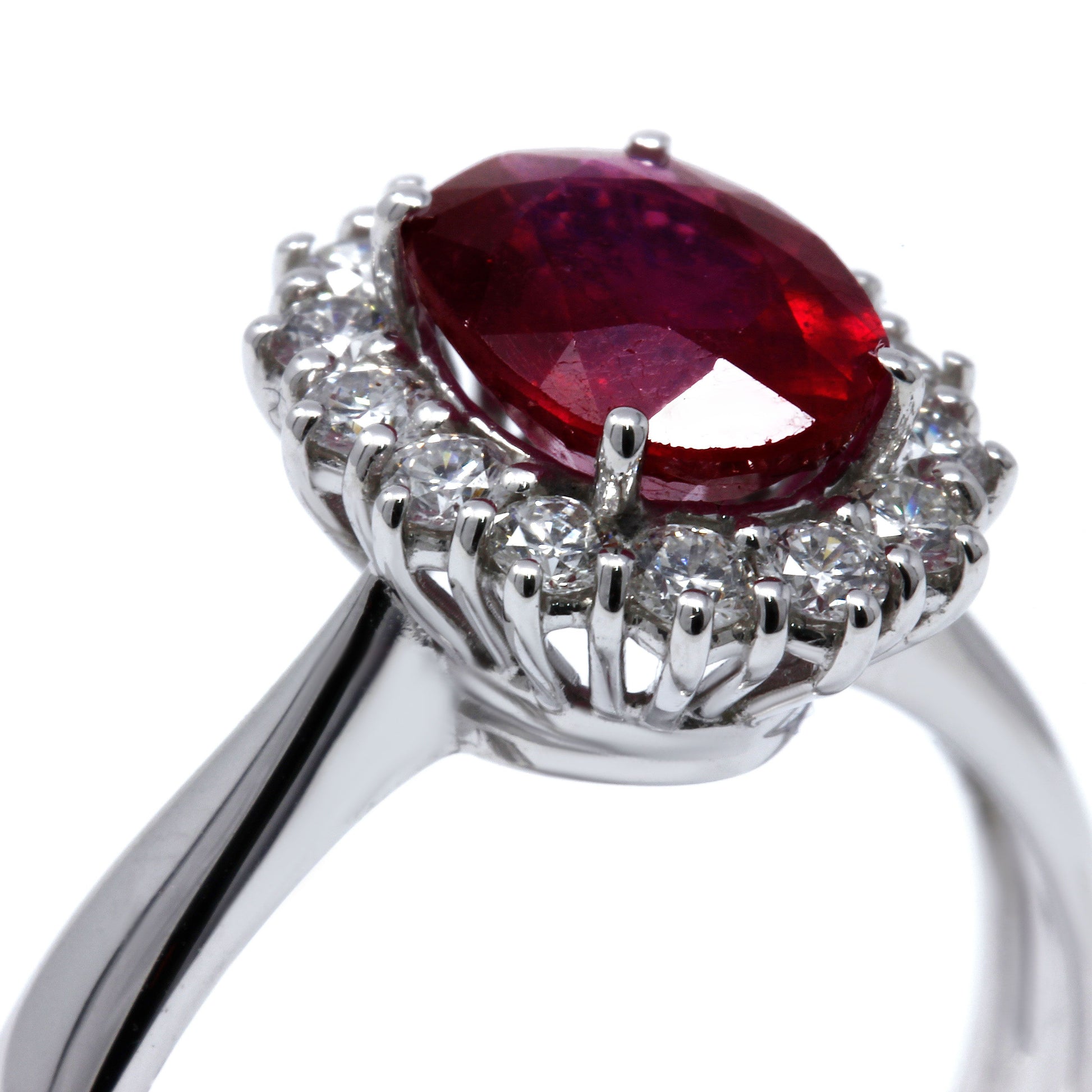 L'anello monta un rubino centrale taglio ovale 6x8 mm, proveniente dalla Birmania, il cui peso è di 1.64 CT e 14 diamanti bianchi, purezza VS 1 colore F, peso 0.41 CT.