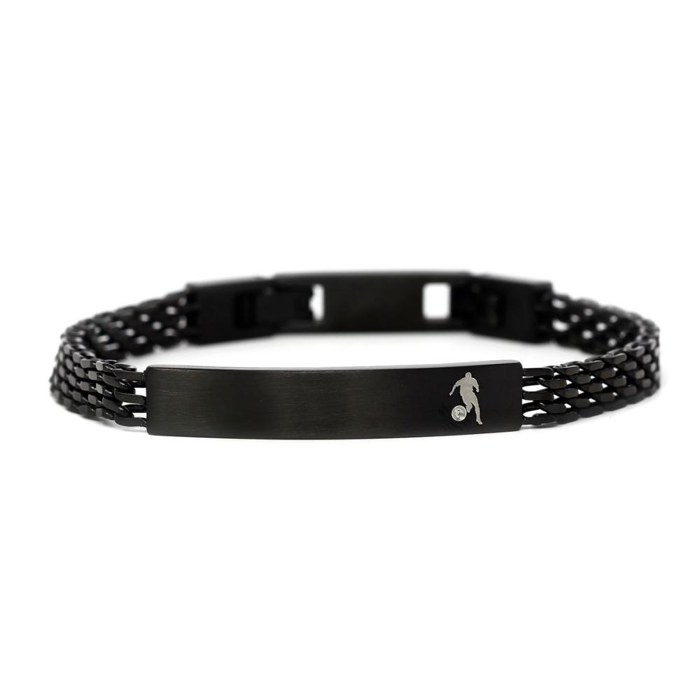 Il pattern esagonale dei palloni da soccer si riflette nei dettagli di questo bracciale da uomo maglia Milano con diamante, un gioiello che esprime tutta l'energia e la vitalità del DNA Bikkembergs. Realizzato in acciaio inossidabile e anallergico dal trattamento ION PLATING (IP) nero, questo bracciale dalle linee essenziali è impreziosito dall'immagine impressa dell'iconico giocatore di calcio del brand e dal diamante naturale bianco taglio brillante da 0,01 carati posizionato a rappresentare