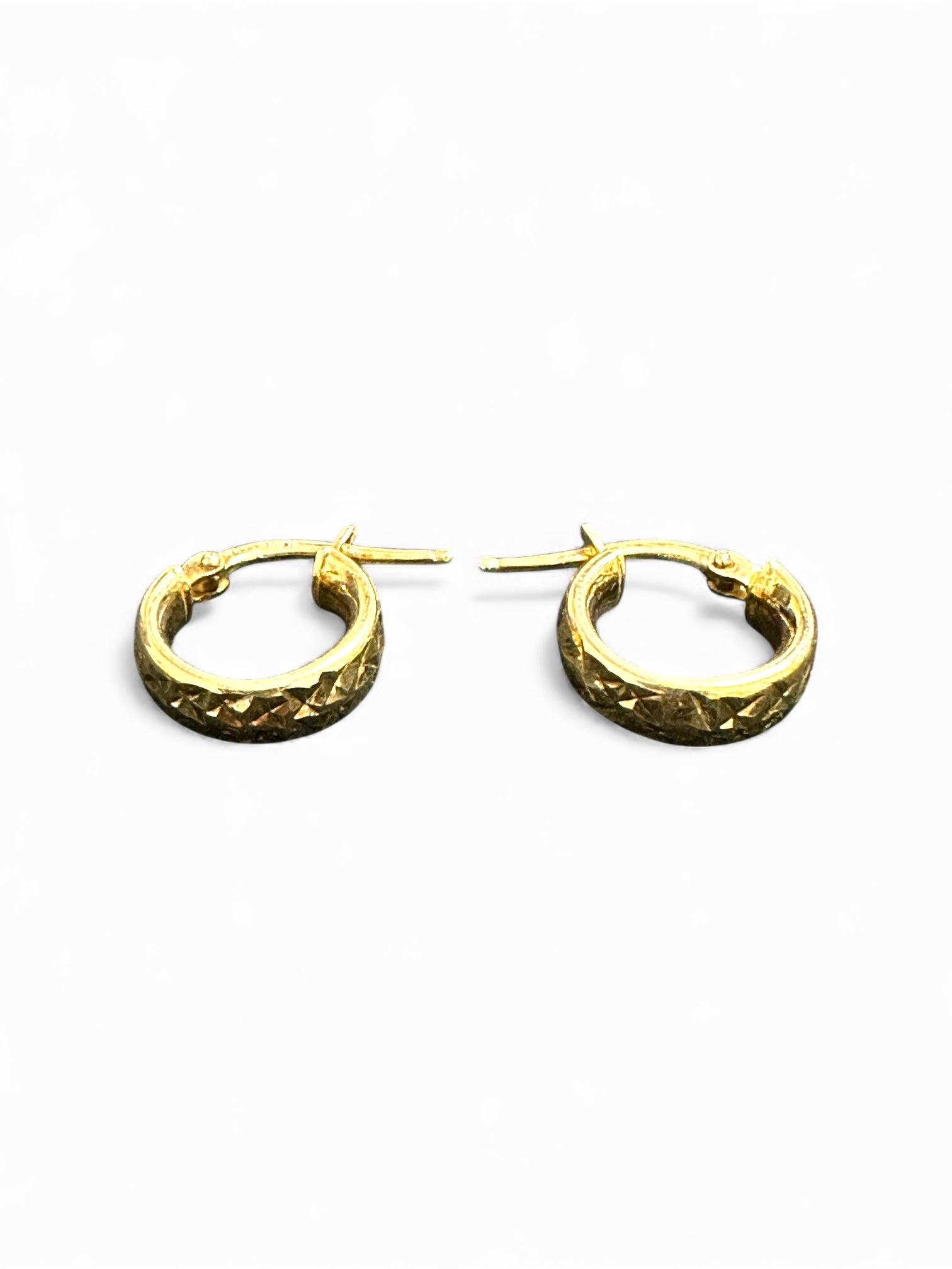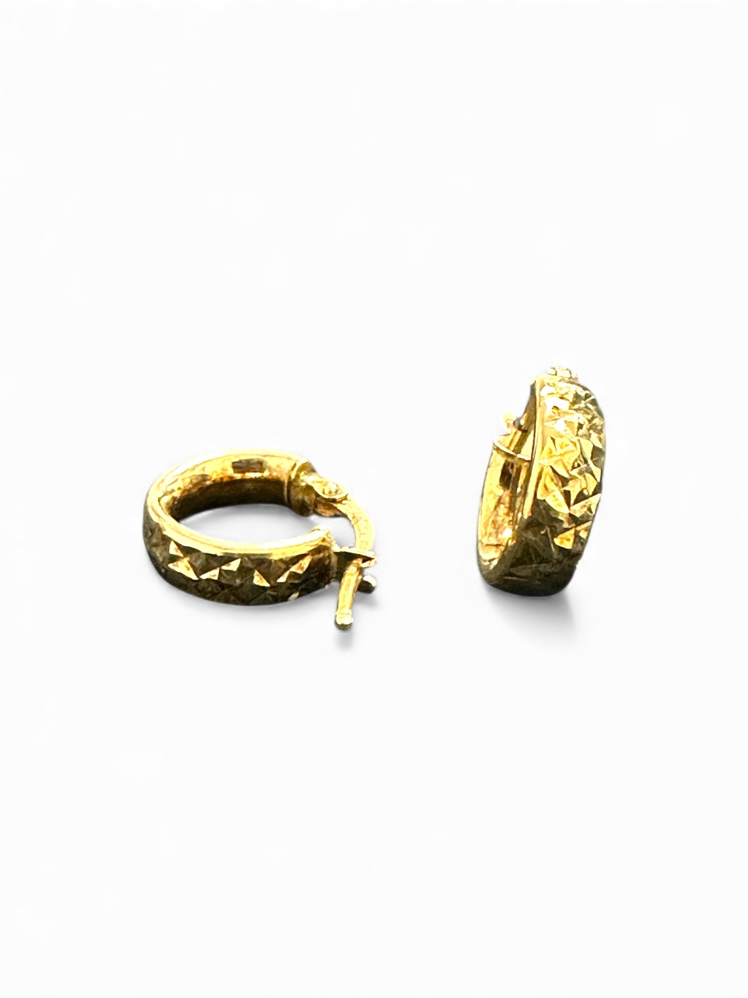 Eleganti e luminosi, questi orecchini a cerchio in argento dorato si distinguono per la raffinata lavorazione Martellata sulla superficie esterna, che riflette la luce creando un effetto brillante e sofisticato senza l’utilizzo di pietre.