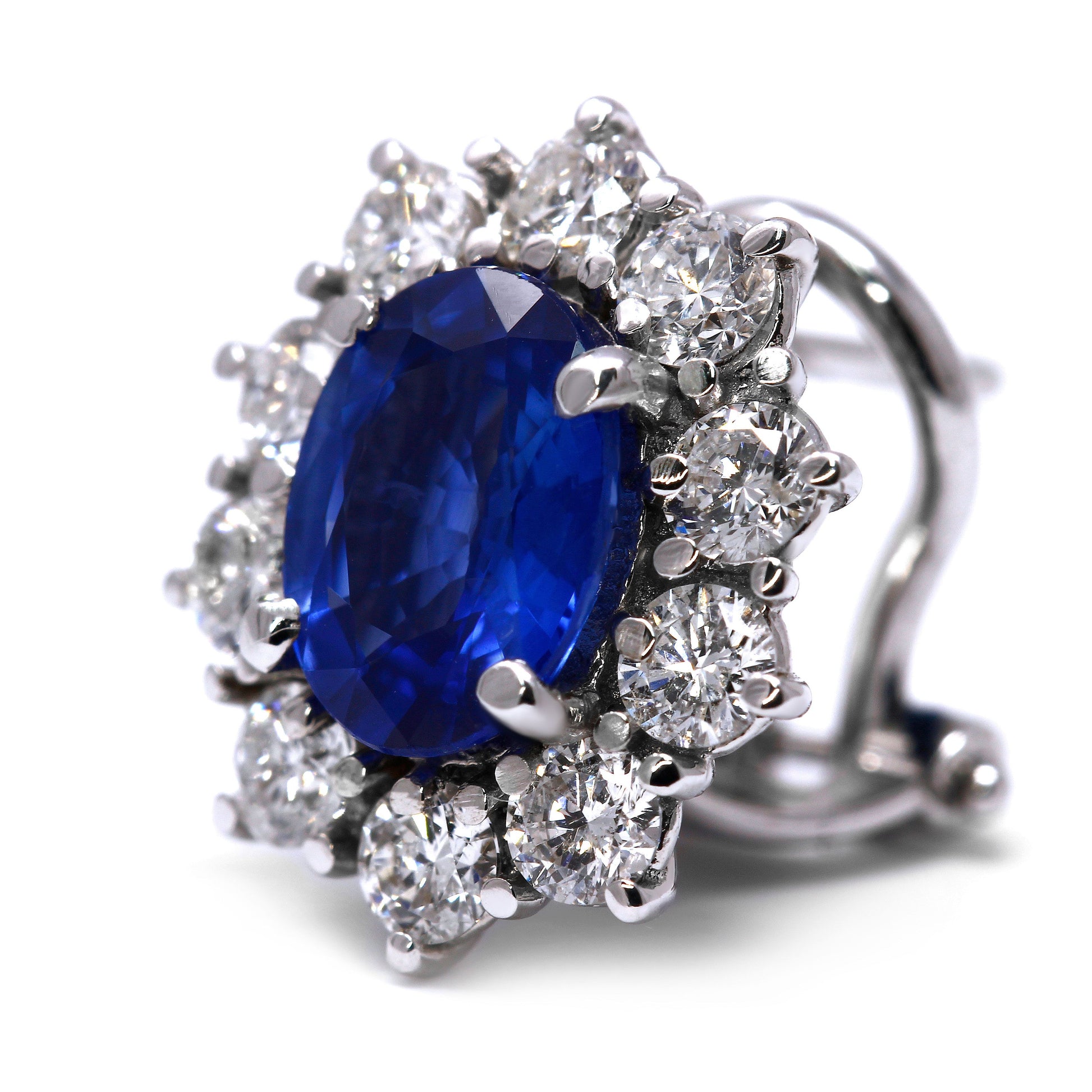 Il gioiello monta 2 zaffiri taglio ovale, 7.5 x 5.7 mm, proveniente dal Ceylon, la cui caratura è di 2.96 CT e 20 diamanti bianchi taglio brillante, purezza VS1 colore F, peso 1.52 CT.