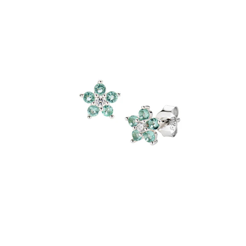 Orecchini a lobo in argento 925 rodiato con zirconi. Due piccoli fiori con centrale in zirconi bianchi e petali di zirconi verde mare, delicati e dolcissimi, da scegliere nel colore preferito per indossarli tutti i giorni.Diametro 7 mm, chiusura con farfallina.