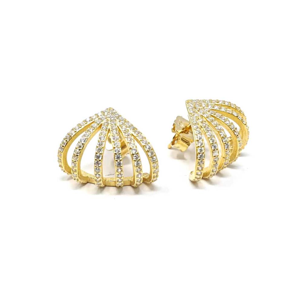 Questi orecchini in argento 925 placcato oro giallo 24kt presentano una forma stilizzata e tridimensionale impreziosita da una cascata di luminosi zirconi bianchi. Eleganti e raffinati, catturano la luce con ogni movimento, regalando un effetto scintillante e sofisticato. Perfetti per chi desidera un gioiello dal design moderno e prezioso, ideale per serate speciali e occasioni eleganti.