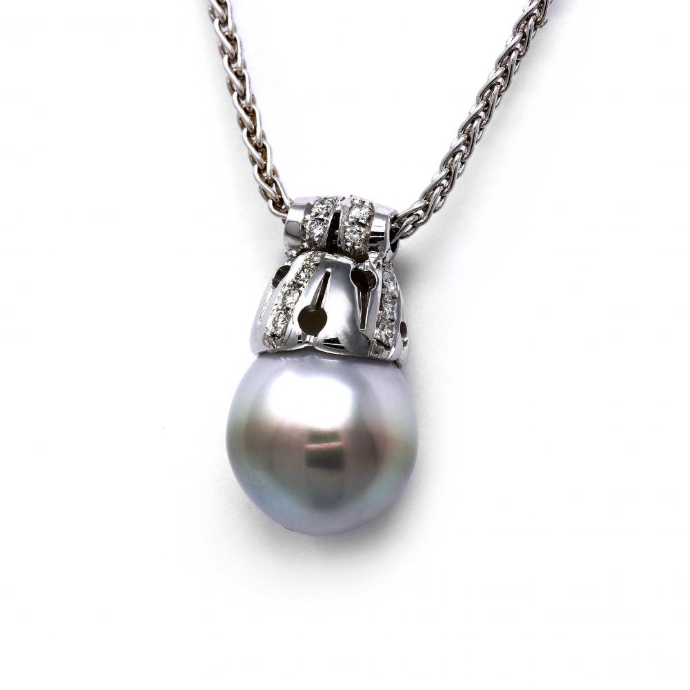 il pendente monta un perla Tahitiana grigia 11.5/12 mm la cui classificazione è AAA, i diamanti bianchi in alto hanno purezza VVS-IF colore F per un peso complessivo di 0,22 CT.