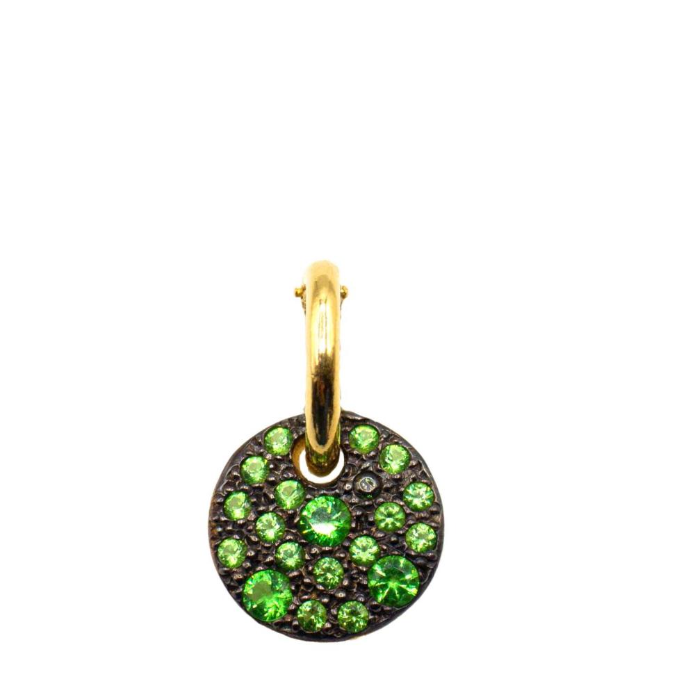 Pendente pavè in argento 925 di forma tonda con uno studio particolare di incassatura mista, arricchito da pietre taglio brillante di svariati colori e dimensioni. Fatto in Italia. (Diametro 11 mm)