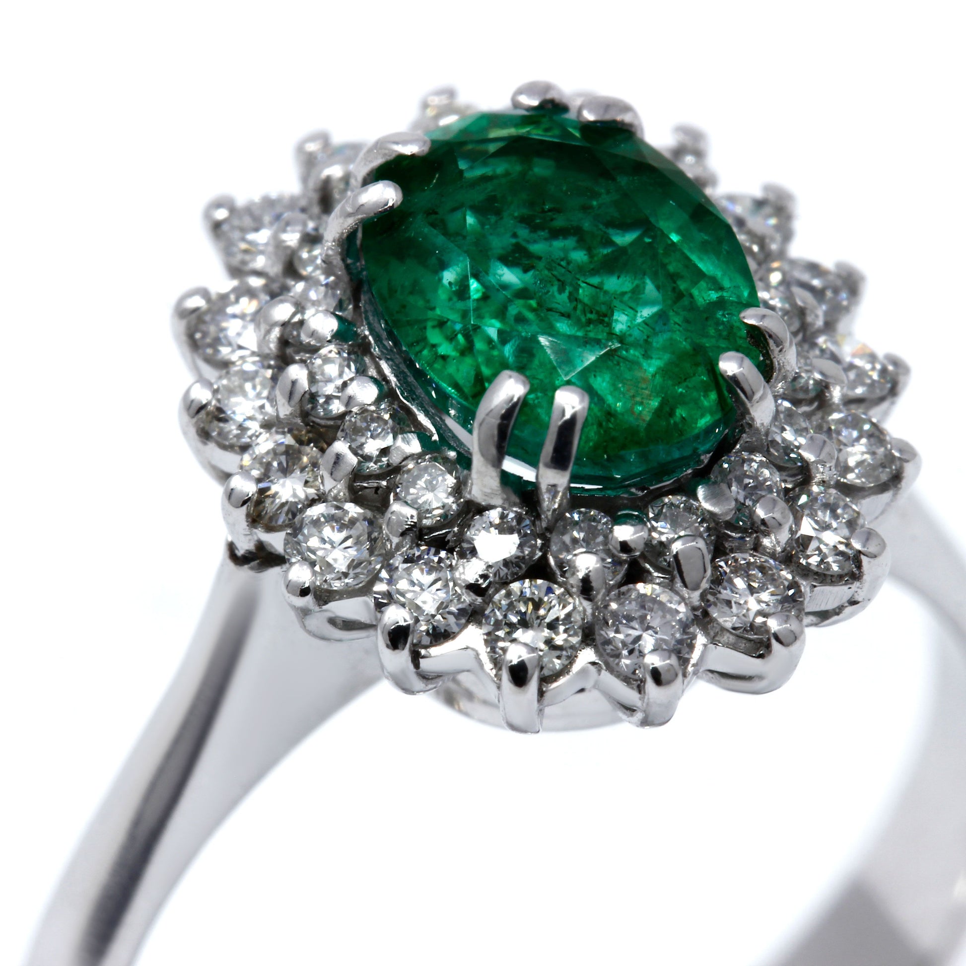 L'anello monta uno smeraldo centrale taglio ovale, proveniente dallo Zambia, la sua caratura è di CT 1.34, 6x8 mm, attorno ad esso sono presenti 36 diamanti bianchi, purezza VS SI colore F, peso CT 0.52.