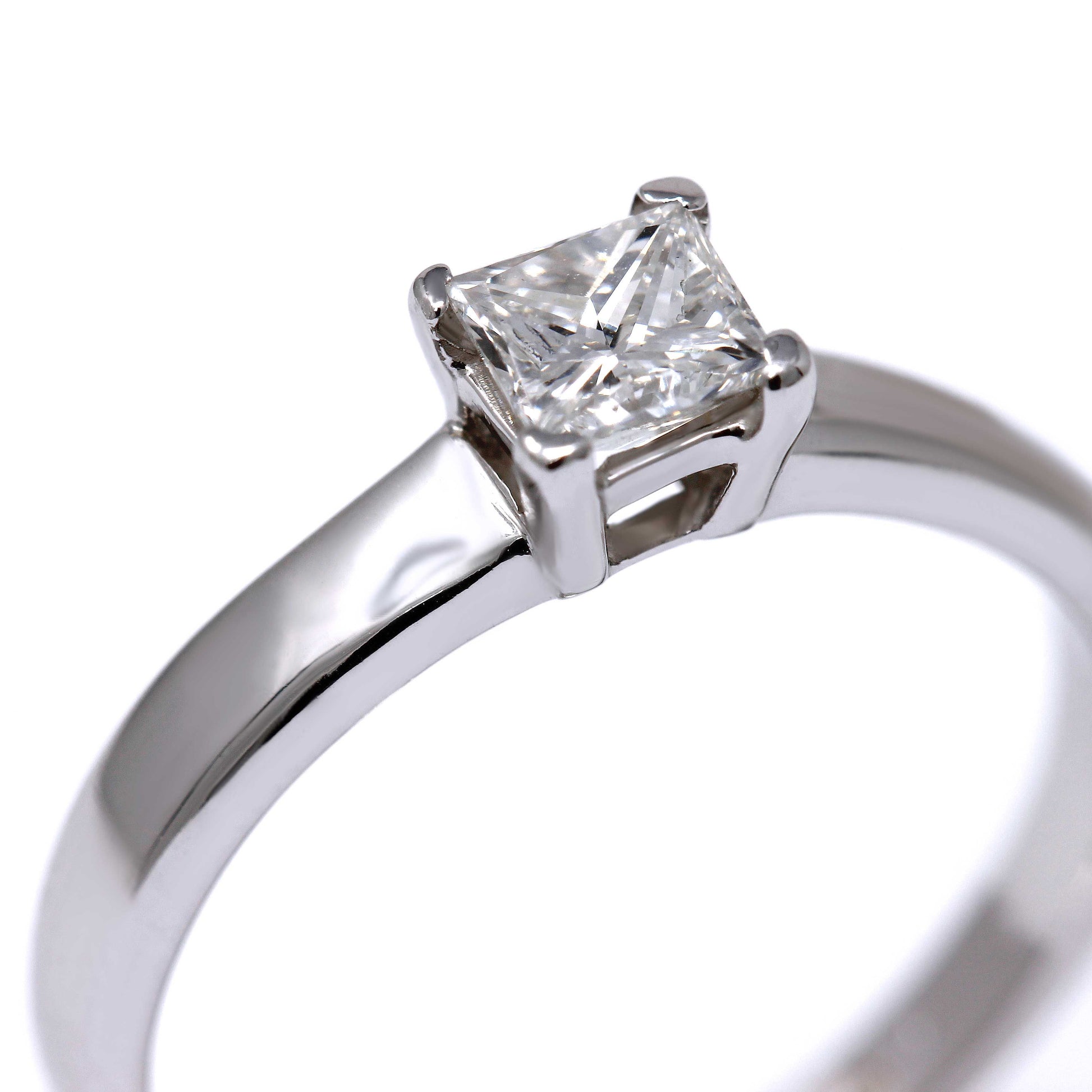 Il gioiello monta un diamante bianco taglio princess, purezza IF colore G, peso 0.42 CT.