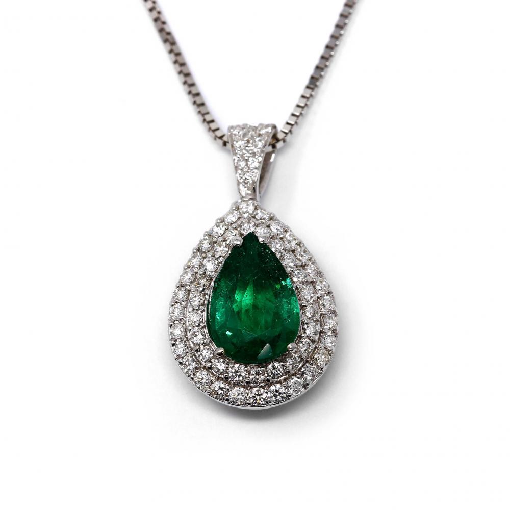 Il pendente monta uno smeraldo taglio goccia proveniente dalla Colombia, la cui caratura è di CT 1.44