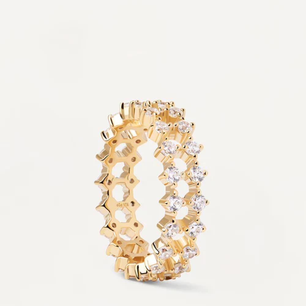 MATERIALE: Argento Sterling FINITURA: Placcatura in oro 18k PIETRE: Zirconi Bianchi DIAMETRO DELLE PIETRE: 2 mm SPESSORE DELL'ANELLO: 6 mmSKU: AN01-882-08