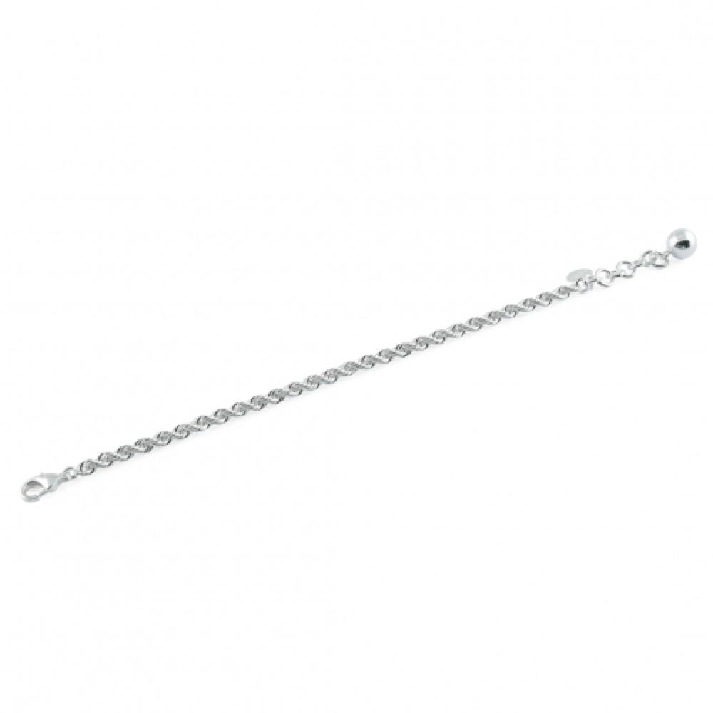 Bracciale di catena in maglia corda con chiusura a moschettone, regolabile grazie ad anelli di allungamento. La particolarissima catena a corda rende questo grazioso bracciale un accessorio unico ed elegante, per non essere mai scontati e banali. Abbinalo alla collana per essere ancor più glamour! Lunghezza: 17 cm + 3,5 cm.