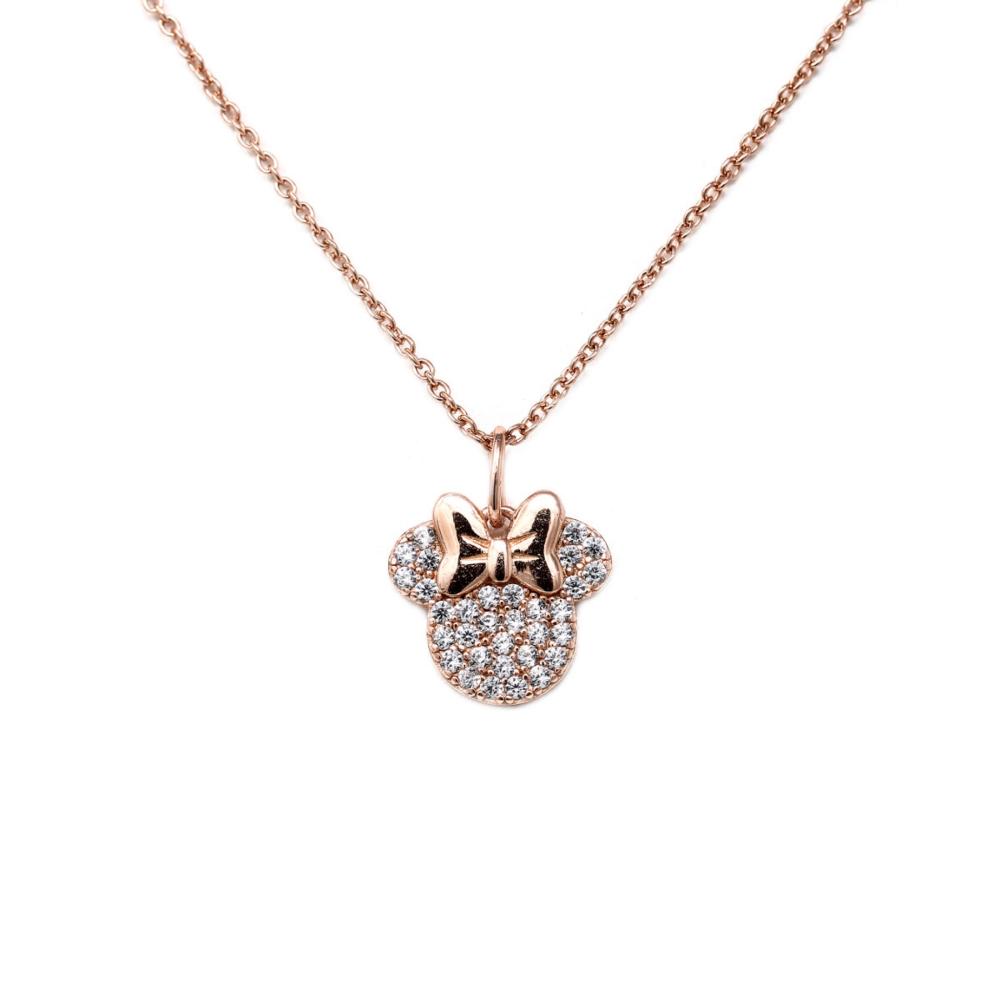 Collana da bambina di Disney della collezione mickey mouse. Gioiello realizzato in argento di colore rose' con zirconia bianco. Collana con chiusura a moschettone. Soggetto: collana con pendente minnie.