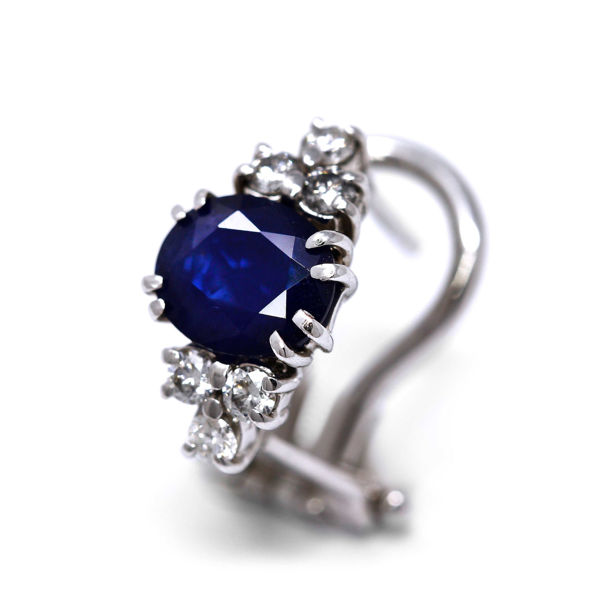 Gli orecchini montano 2 zaffiri taglio Ovale 5.5 x 6.5, provenienti dalla Thailandia, il cui peso è CT 1,90 Thailandia sono incastonati un tris di diamanti sopra e sotto lo zaffiro, montando complessivamente 12 diamanti bianchi, purezza VVS-IF colore F dal peso CT 0.36.