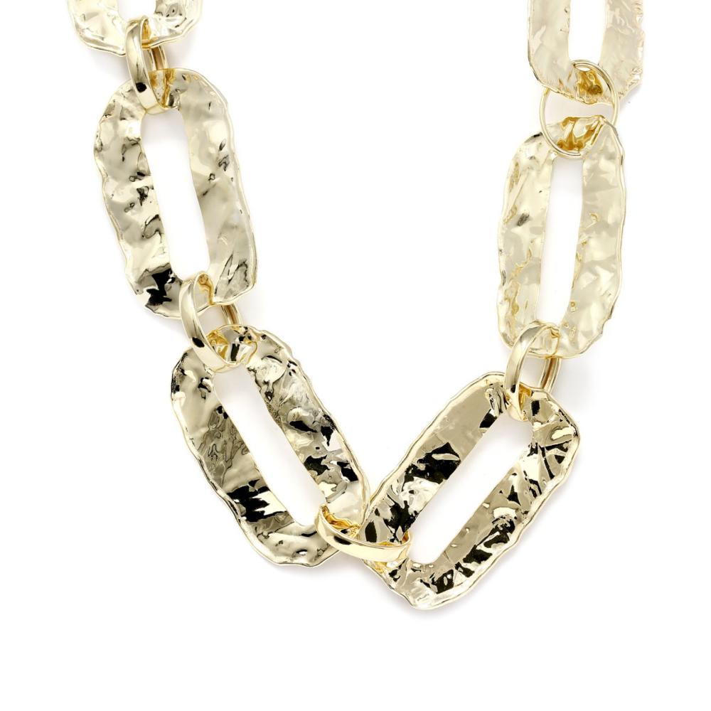 Questo girocollo in argento 925 placcato oro 24kt è caratterizzato da grandi maglie piatte lavorate a mano con effetto martellato, che richiamano lo stile etrusco reinterpretato in chiave moderna. Le superfici irregolari e luminose conferiscono al gioiello un aspetto deciso e sofisticato, ideale per chi ama accessori importanti e di carattere. Perfetto per valorizzare look eleganti o per aggiungere un tocco di originalità a un outfit quotidiano, è un gioiello che non passa inosservato.