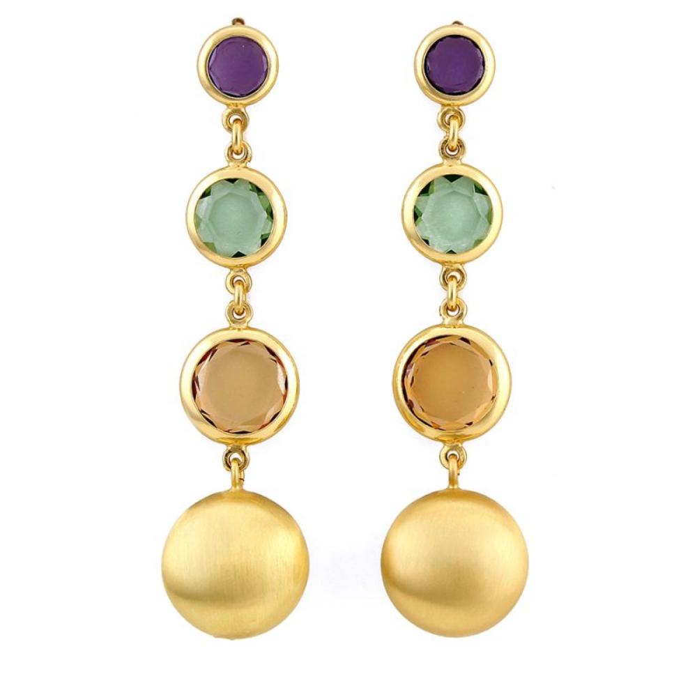 Orecchini in AG 925‰ placcato oro giallo 23 ct, con paste vitree in diverse nuances e pastiglia finale pendente satinata a mano. Cm 6,5