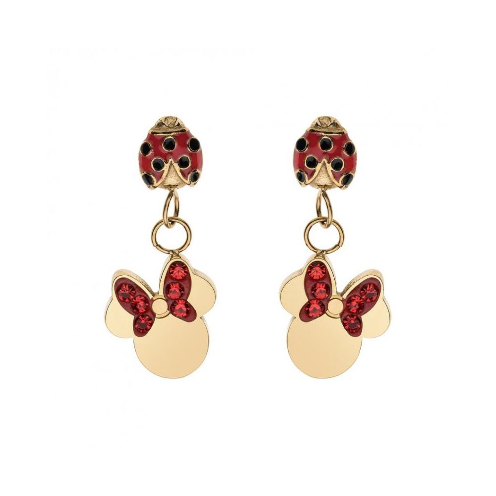 Orecchini da donna e bambina realizzati in acciaio anallergico con finitura dorata.Elemento a lobo a forma di coccinella e pendente a forma di Minnie impreziosito da cristalli rossi.Chiusura con farfallina a lobo.