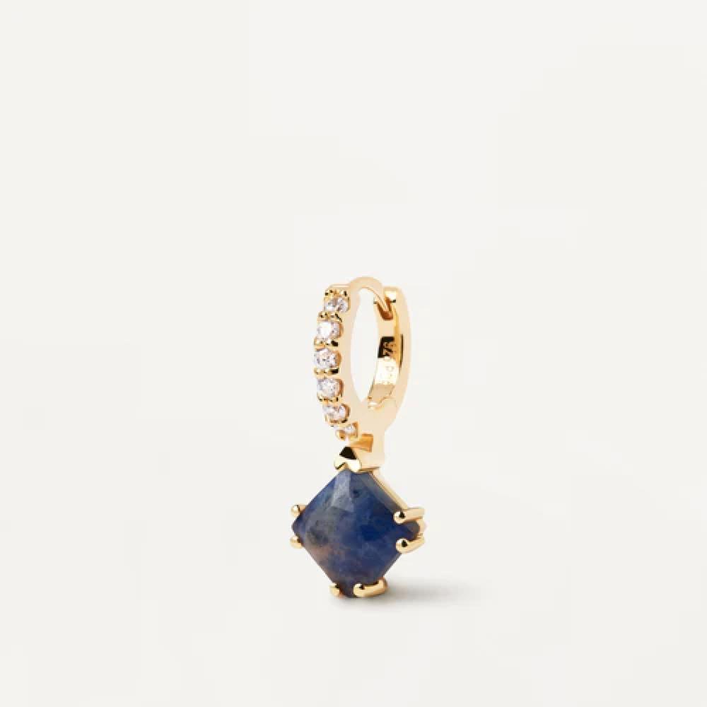 Orecchino a cerchio placcato oro con zirconi bianchi e ciondolo con gemma quadrata blu scuro