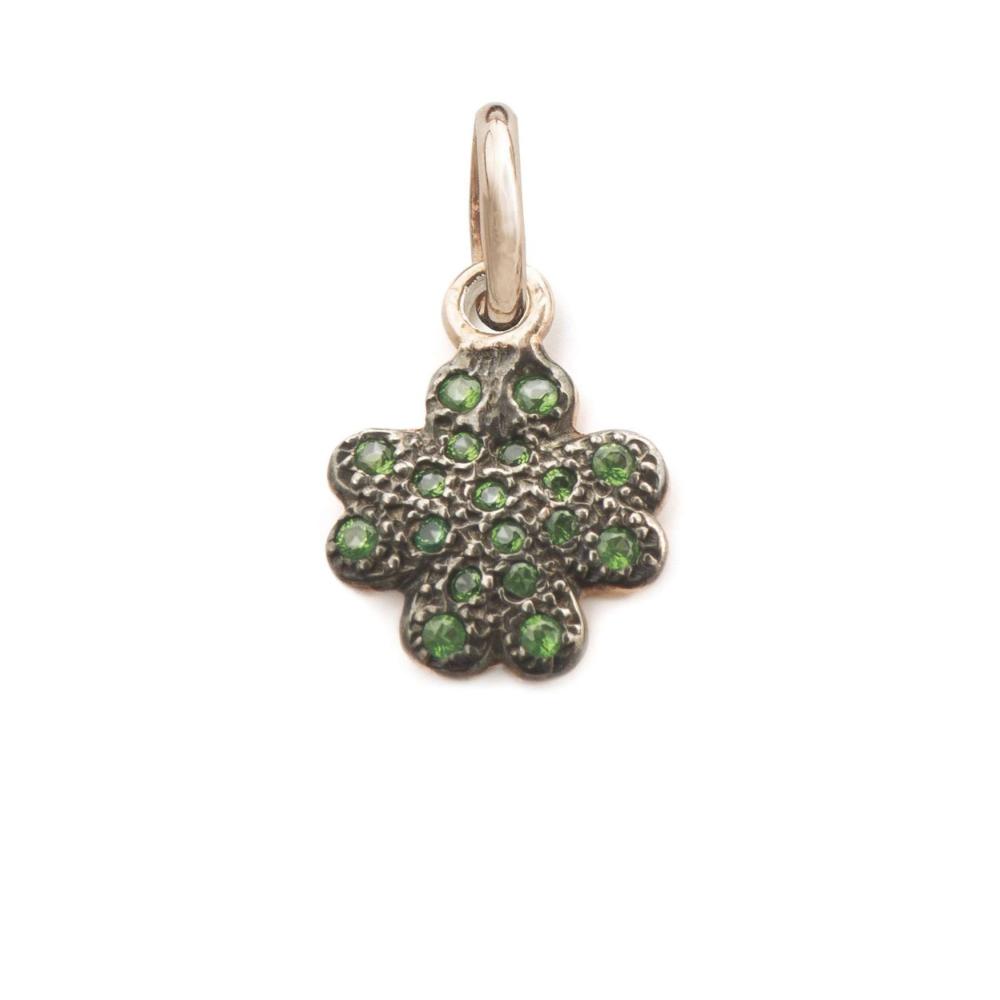 Pendente pavè in argento 925 a forma di Quadrifoglio con uno studio particolare di incassatura mista, arricchito da pietre taglio brillante in tre colori. Fatto in Italia. (Dimensione 10x10mm)
