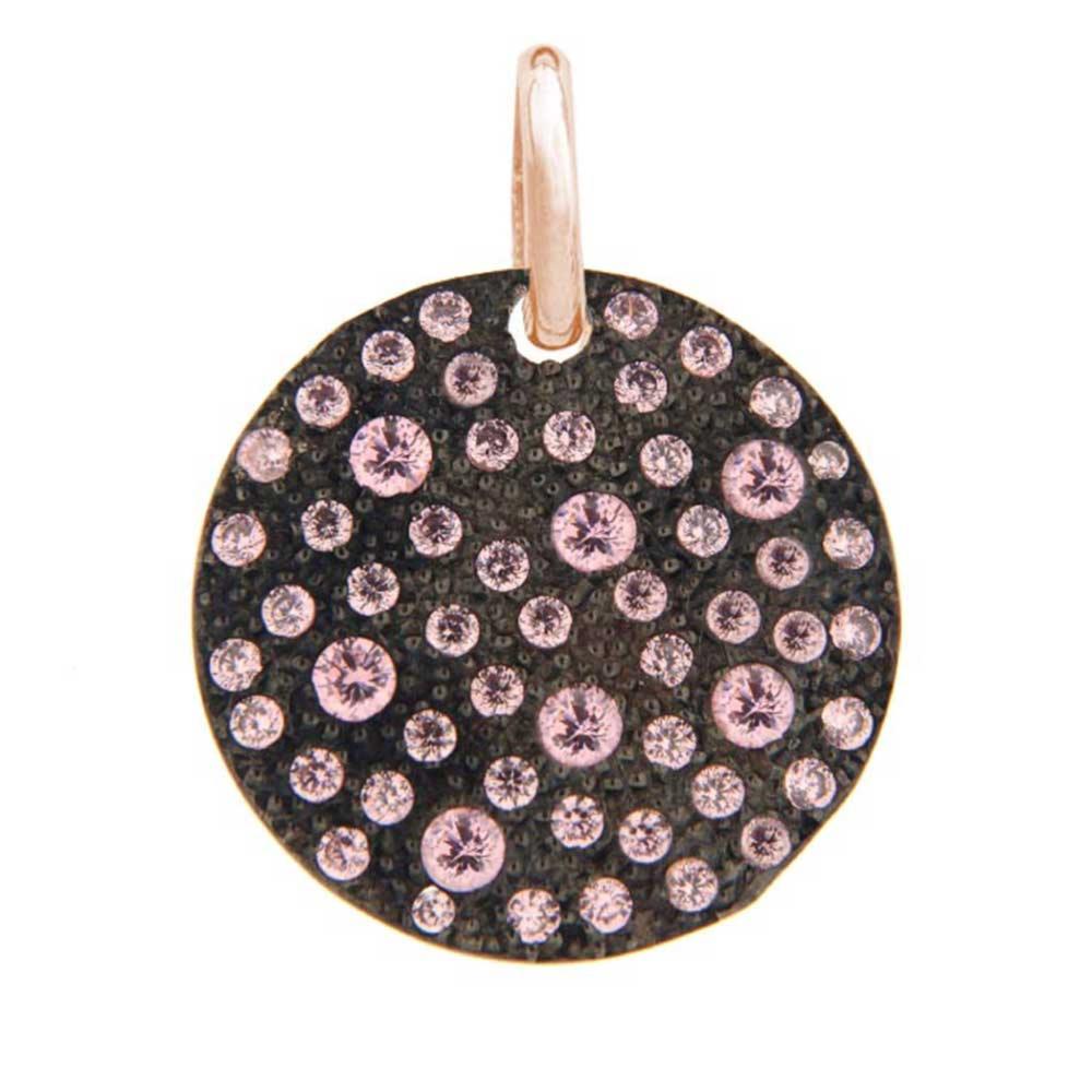 Pendente pavè in argento 925 di forma tonda con uno studio particolare di incassatura mista, arricchito da pietre taglio brillante di svariati colori e dimensioni. Fatto in Italia.