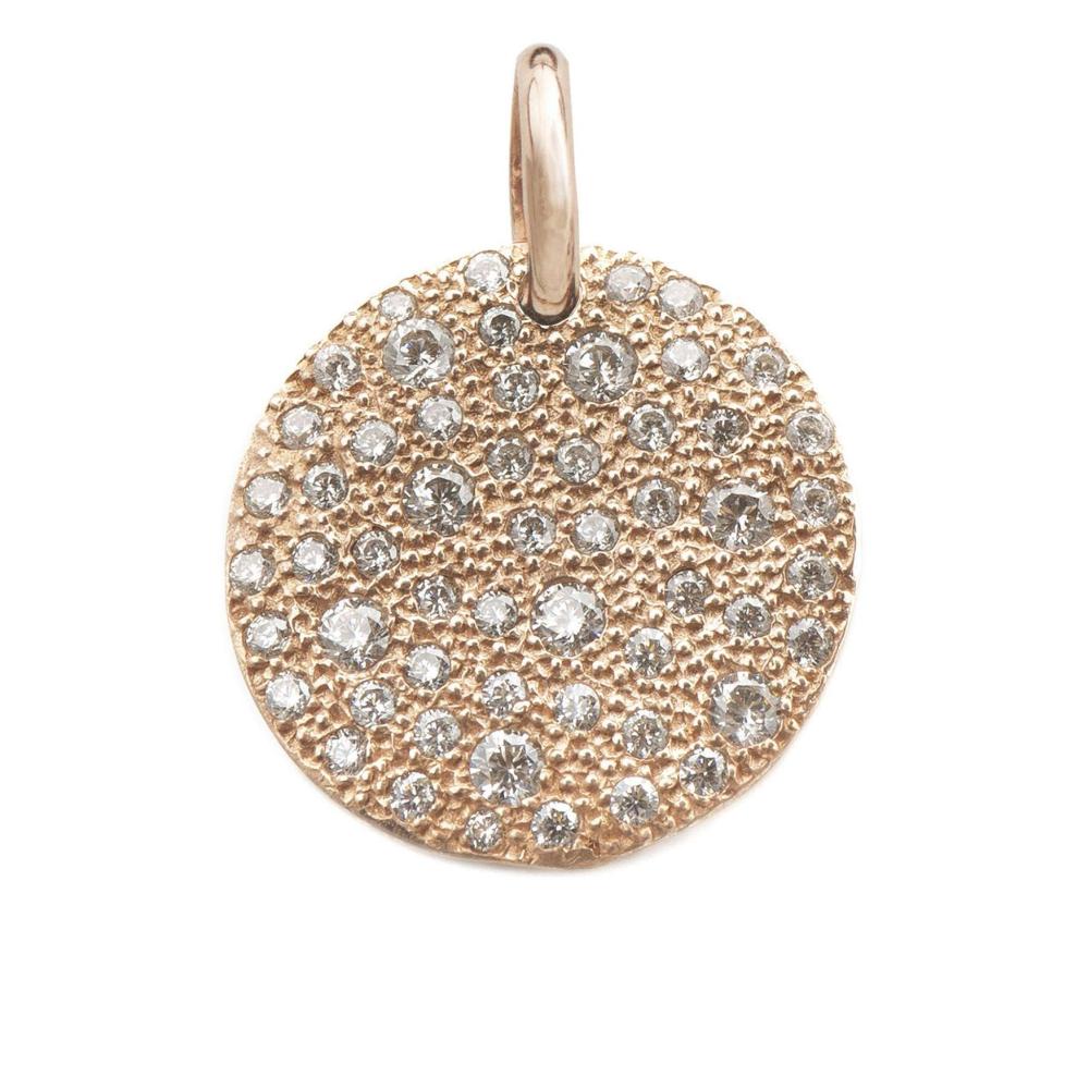 Pendente pavè in argento 925 di forma tonda con uno studio particolare di incassatura mista, arricchito da pietre taglio brillante di svariati colori e dimensioni. Fatto in Italia. (Diametro 22 mm)
