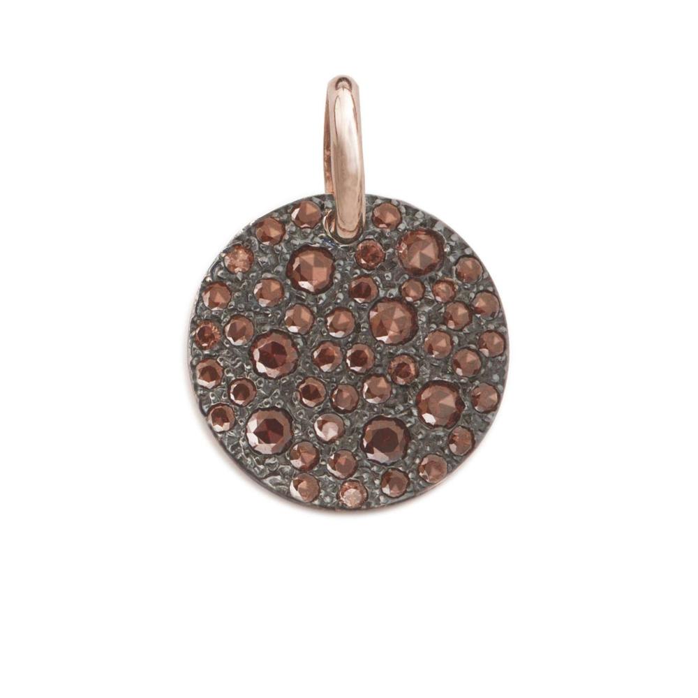 Pendente pavè in argento 925 di forma tonda con uno studio particolare di incassatura mista, arricchito da pietre taglio brillante di svariati colori e dimensioni. Fatto in Italia.