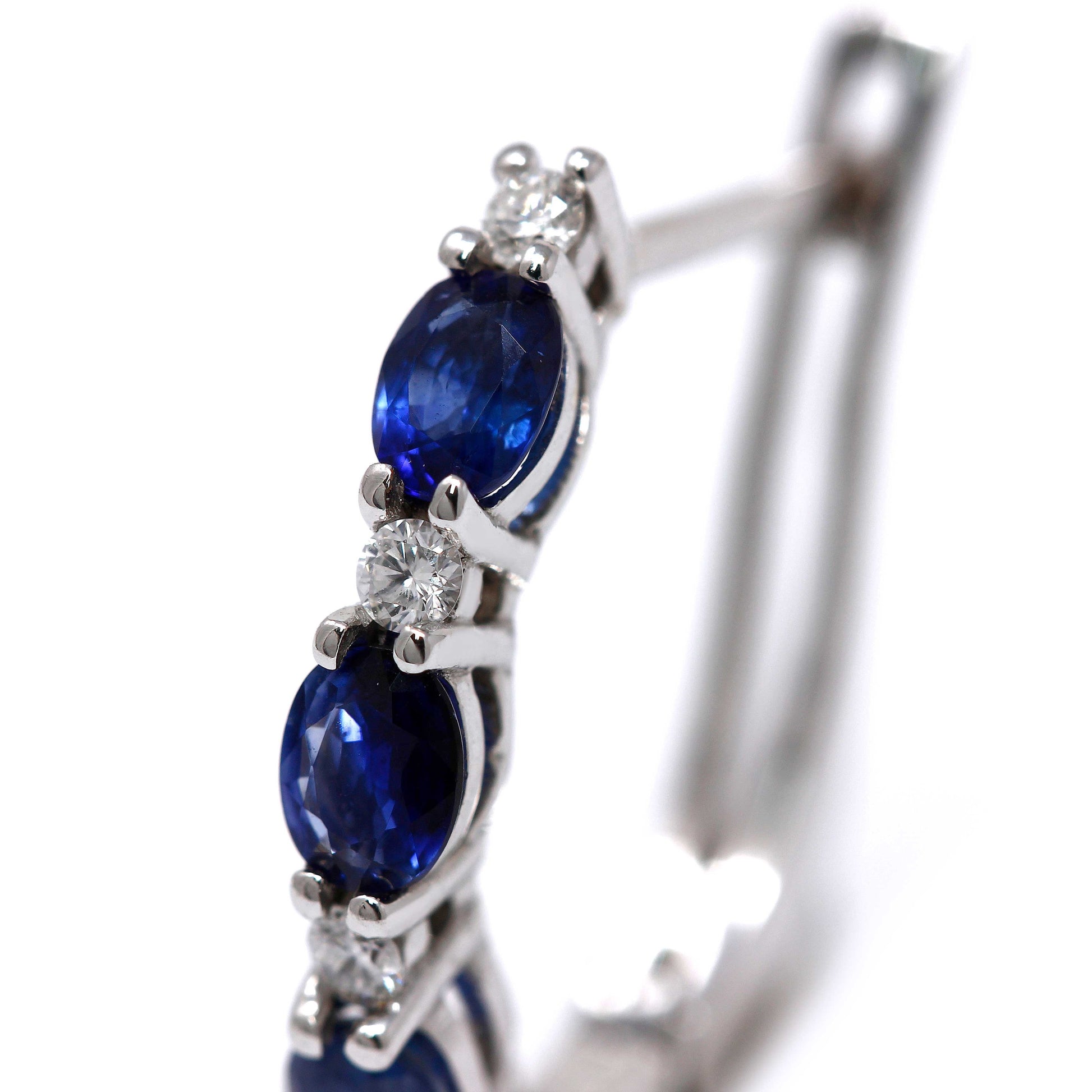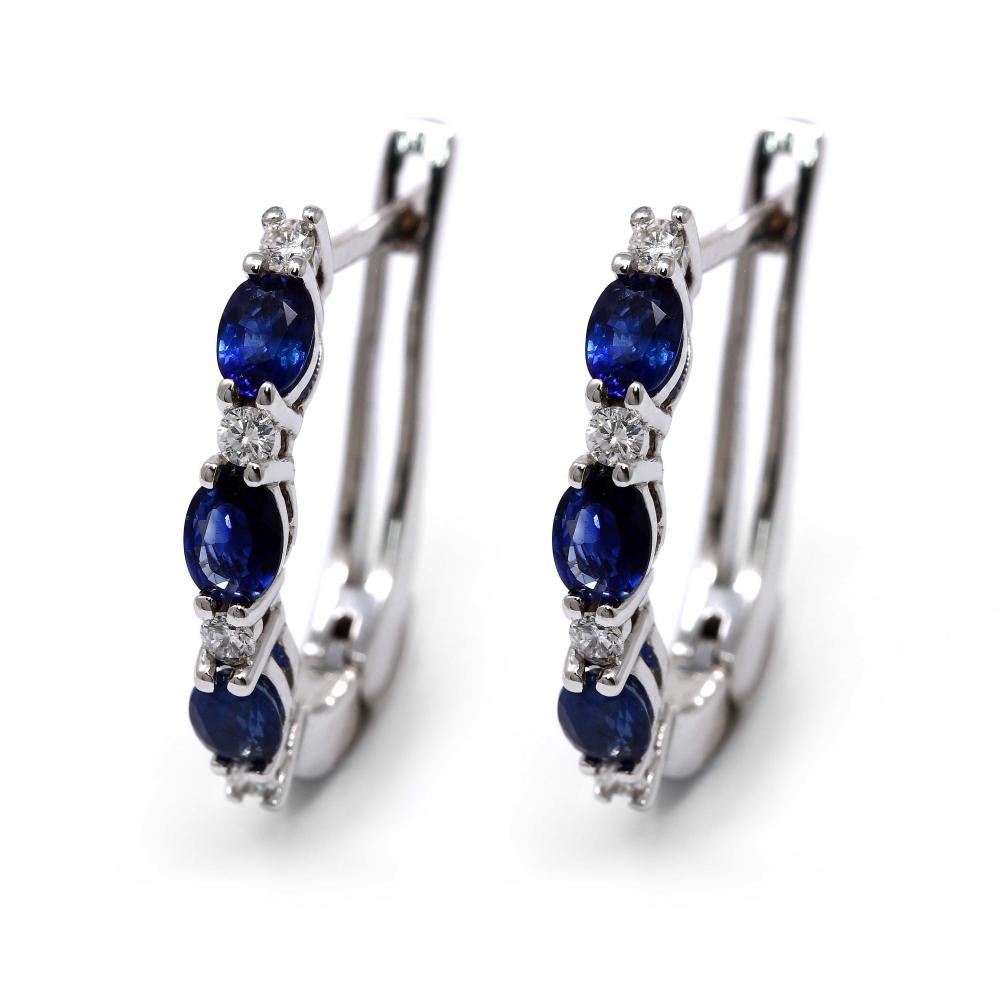 Orecchini modello Trilogy, montano 8 diamanti bianchi purezza VS-SI colore F, peso complessivo CT 0,21 e 6 Zaffiri taglio Ovale 3x4 il cui peso è CT 1,32. Provenienza Ceylon